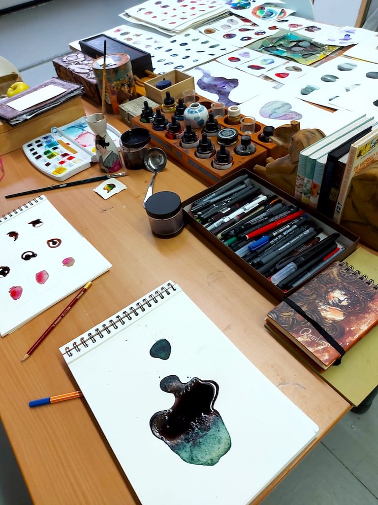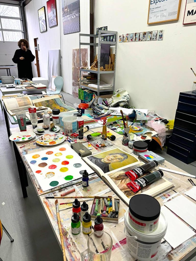 Mijn atelier in Zoetermeer is niet echt een klein cafeetje. Het is groot, licht en een behoorlijk rommelige werkplek. Toch ben je welkom. Maak een afspraak en we kijken samen naar mijn kunst en werkwijze of we hebben gewoon een fijn gesprek over inspiratie. Natuur, steden, oude culturen, voorouders en papier kunnen allemaal inspiratiebronnen zijn. Je bent van harte welkom.