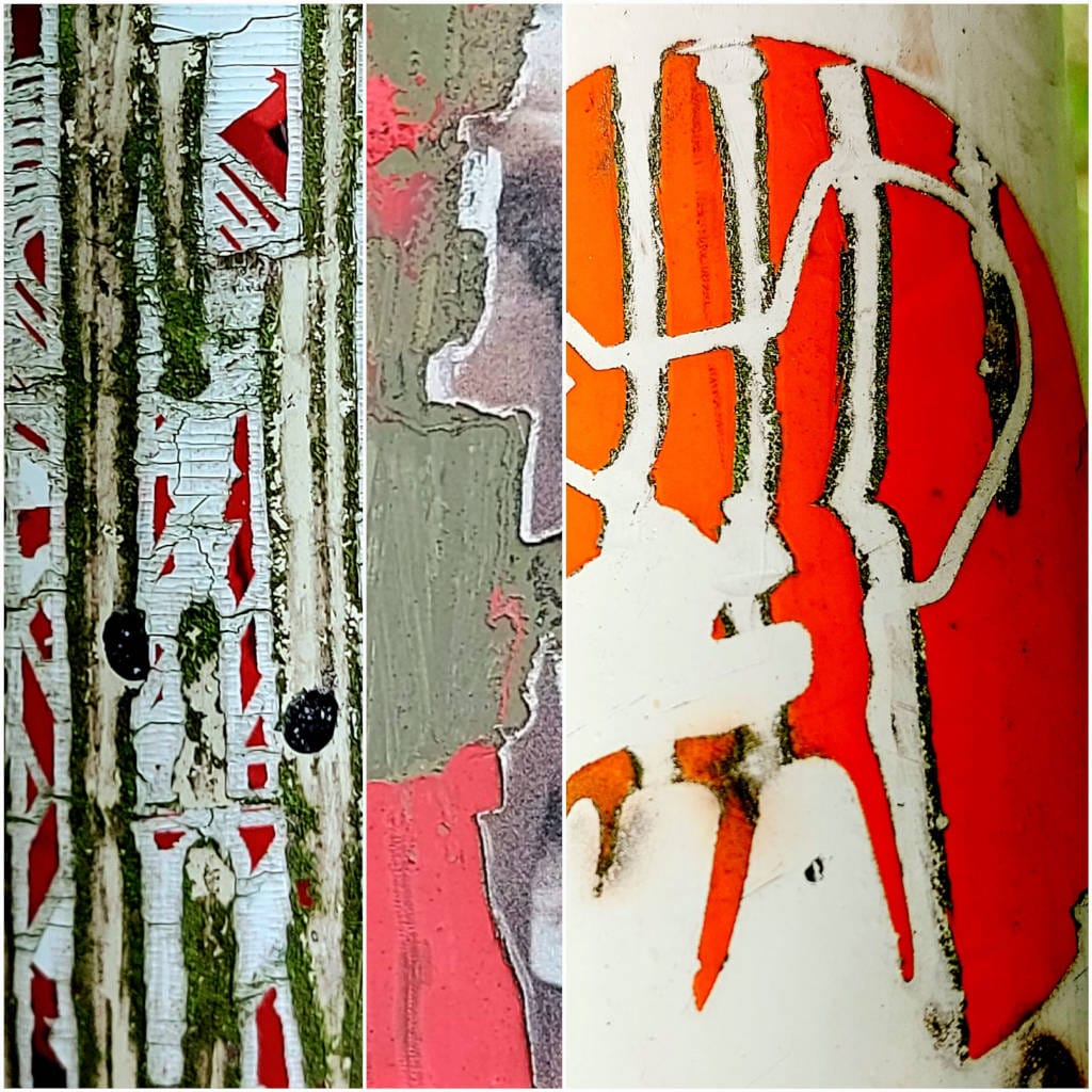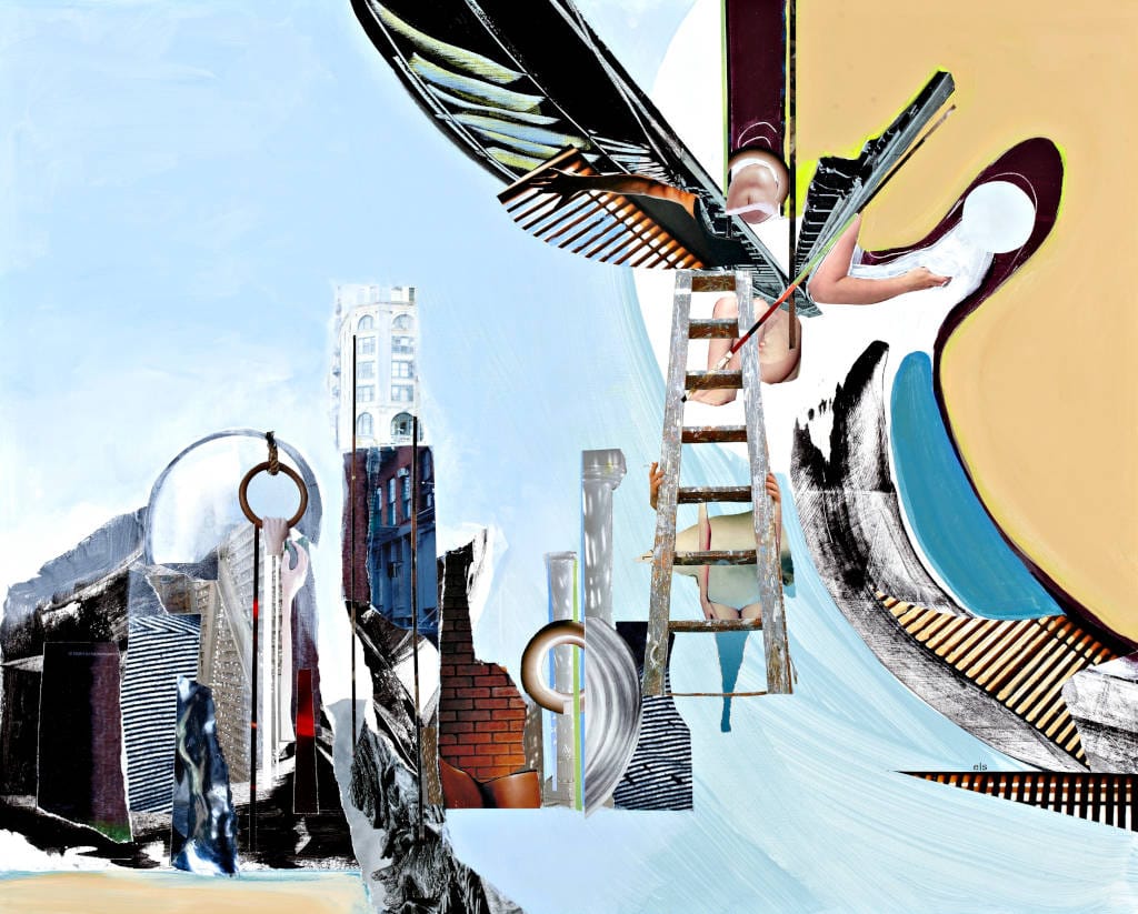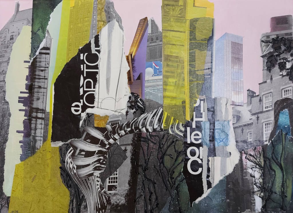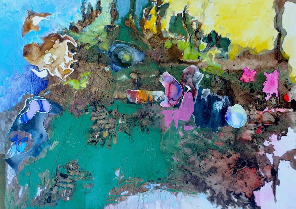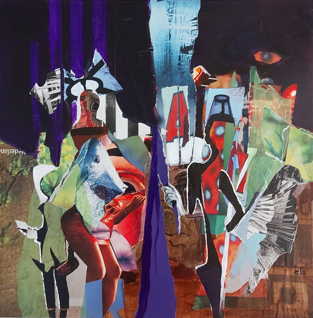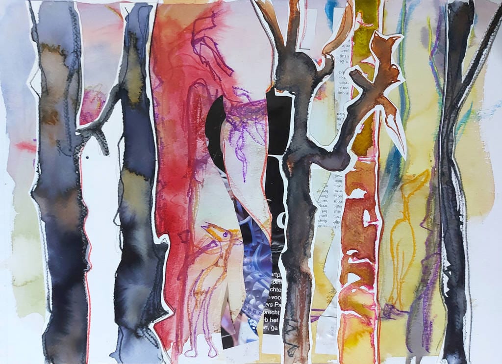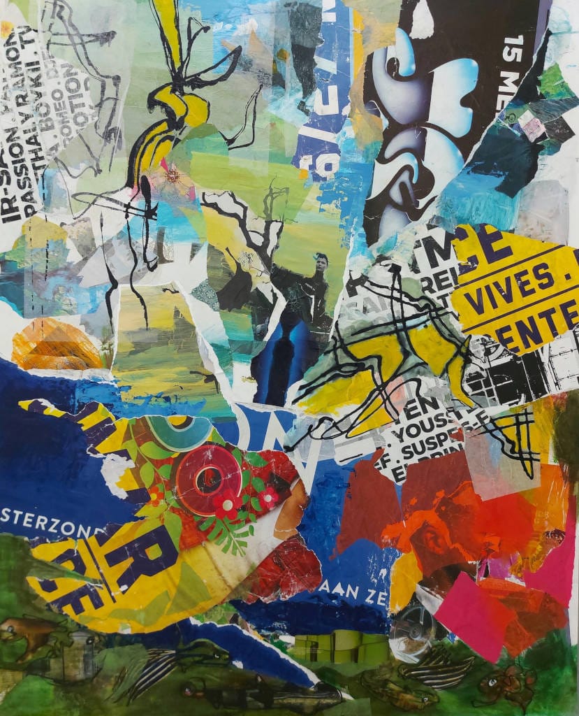 In bijna ieder papiertje zie ik een bruikbare en interessante vorm of een nieuw kunstwerk. Ik beschilder, verzamel en fotografeer ze. Tot ze uiteindelijk in een collage worden verwerkt. Eindeloos schuiven met snippers en fragmenten zorgt voor vormen die ik niet zelf zou hebben kunnen bedenken. Vliegerpapier, papier met inkt bewerkt, tijdschriftfragmenten, zijdepapier, Japans papier… ik gebruik het allemaal. Snippers weggooien kan ik niet. Ook fotografeer ik afgebladderde posters in de stad. De verweerde posters gaan mee naar mijn atelier om onderdeel te worden van de verzameling papier. Gevonden materialen zorgen dat toeval een rol speelt en leveren nieuwe kleurcomposities op in combinatie met mijn teken- en schilderwerk. Niet ieder detail is helemaal uitgewerkt waardoor de kijker de kans krijgt de eigen fantasie erop los te laten.